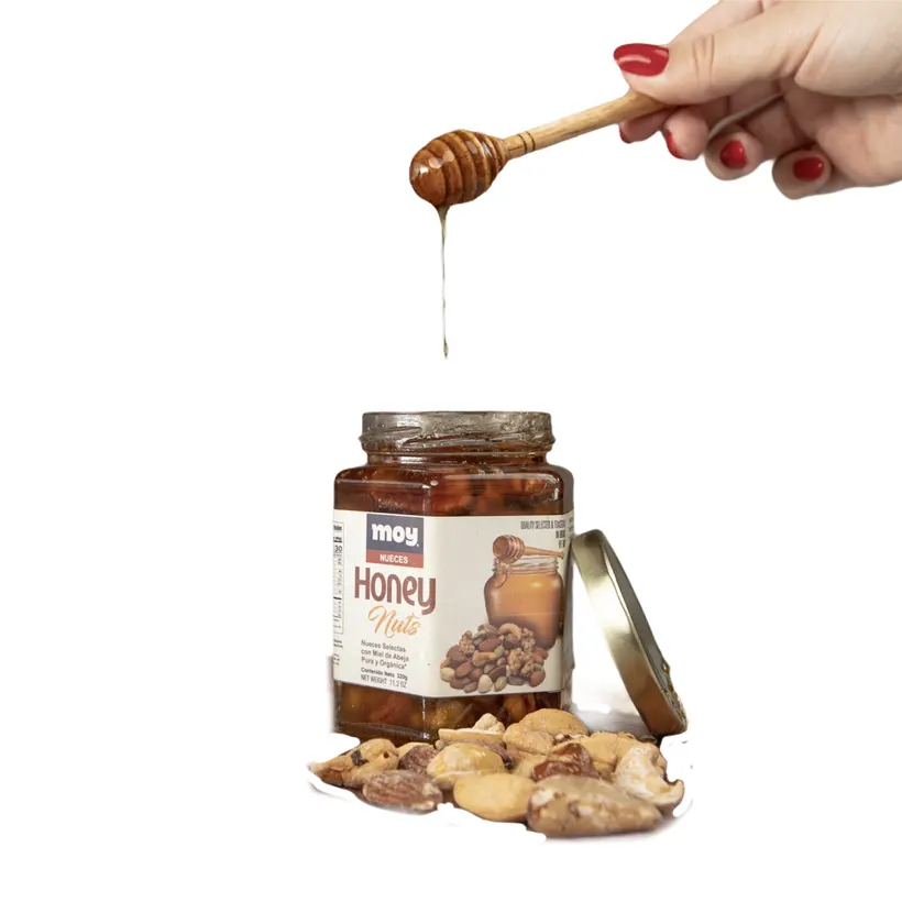 Deliciosa mezcla de miel de abeja natural, con frutos secos como: nuez pecana, nuez de la india, avellana....